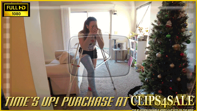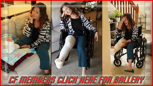 Victoria's excited to get back to the gym and since it's just around the corner, she's doing her stretches at home before she leaves. She goes through a couple of stretches, but when she's stretching the back of her leg, she hears a snap and the heel of her left foot is in extreme pain. She calls a friend to take her to the hospital. Next, she comes home in a pointed white SLC with an ankle sock over the toes. They didn't give her any painkillers, so she's in a great deal of pain and awkward on crutches. She makes her way to the kitchen and because she's not used to her cast, she bangs it a couple times, ending up with her on the floor moaning in pain. She makes her way to the living room where she slowly and painfully removes her sock and props her leg up on some pillows as she whines about her terrible situation. Next, it's another day and Victoria is going to attempt to get out of the house and see some friends. Still in a lot of pain, she carefully pulls pantyhose over her SLC and puts on a nice shoe. After touching up her hair in the mirror, she heads towards the front door when she slips on the rug and starts to fall. To be continued...