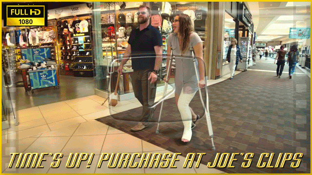 Holly was recently hit by a car and luckily her only injury was a broken leg. Her lawyer has advised her to document her everyday life for her upcoming lawsuit. She's hoping to get as much money as possible. She's enlisted her friend to film for her. What you see here is all the "unedited" footage including stuff that she would not want to be seen (not realizing she's being filmed), like her staging hardships and discomfort. The clip starts off with her telling her friend/cameraman how they're going to "get that money" and what she needs to show on camera. Next, it's off to the department store where she explains exactly what kind of footage she's wanting to get there. First she wants to show her struggles with crutching and then her humiliation from driving a scooter. For a while, she pushes a shopping cart, hopping behind it on her good foot, talking about how this cast has ruined her summer plans. Before long she switches back to crutches but she has trouble crutching and pushing a shopping cart so she gets a scooter. She stages some scenes where she has trouble getting up and hopping to get things. The cameraman seems to have his own motivations as he gets some closeups of her wiggling toes propped up and she notices, commenting that it's weird. After the store, she tries to stage a scene to make it look like it's hard for her to pump gas. Then, at the park, she's a little disappointed that you didn't get her fall at the department store on film so she tries to recreate it.