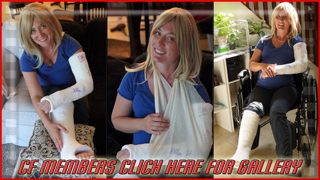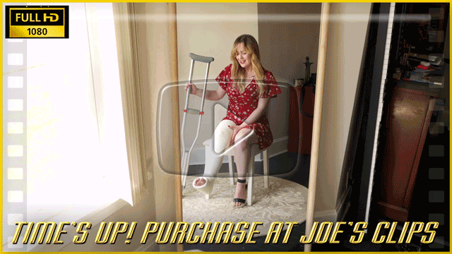 Ellen has discovered that she loves her cast and loves being casted. As her cast ages, she finds that she loves the smell of her blue SLC and casted toes. She starts off in bed in this clip, smelling her casted toes and not being able to resist rubbing one out before getting up. She crawls out of bed and scoots down the stairs. In the kitchen, she crutches around, getting herself a snack, when she hits her cast with the refrigerator door. This gives her the idea to be a little bit more rough on her cast, in hopes of getting to keep it longer. Cut to weeks later and her cast is noticeably older and dirty. She sits down and calls a friend, telling her about her cast and how she doesn't want to lose it yet. Once she's off the phone, she starts sniffing, licking and sucking her toes again as she masturbates with a vibrator. Finally, she tries jumping off the couch in an attempt to keep her cast longer.