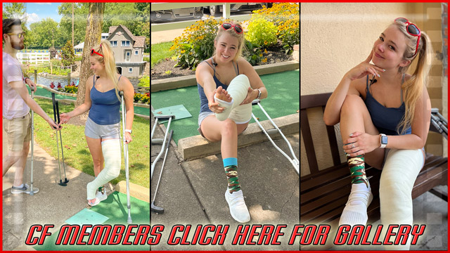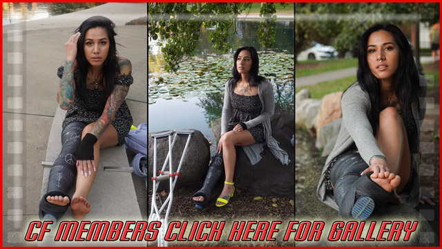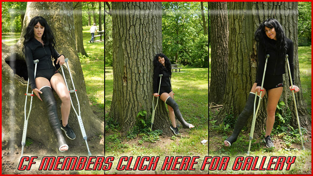 This shoot happed just a few hours ago TODAY (the 15th) and I was able to rush home and get it ready for an update. Jessie's a hot new model with great legs and feet that showed up in daisy dukes. The idea for the shoot just popped into my head. I asked her to pretend that she's just a regular model doing an outdoor shoot but she just so happens to have broken her leg about a week ago. She wants to keep working as a model even while she's casted and is grateful to anyone who is willing to work with her in her cast. She doesn't have any acting experience but she was perfect for this story and did an excellent job. She ad-libs and talks as she models in her LLC as best as she can. She's also new to crutches so she thanks the photographer for being patient with her, as well as being willing to shoot with her with her leg in a big cast. She crutches over to stairs for the first time and models up on the stage. She sits her crutches aside and hops into other positions. Sometimes she accidentally bumps her leg and yelps. After a few minutes, she says she needs to take a break to elevate her cast and wiggle her toes. She talks about her cast as she wiggles her cute casted toes and even brings her good foot into it. Oh, and she's got a cute southern accent. Let me know what you think of this model/theme.